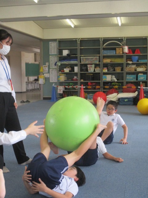 バランスボールを使いながら、静と動の両方の動きを体験しました。みんな元気いっぱい笑顔で取り組めた1時間でした。