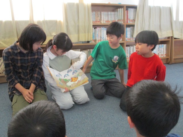「おすすめの本を話し合おう」の学習で1年生におすすめしたい本を班で決めました。今日はその本を1年生に読み聞かせしました。