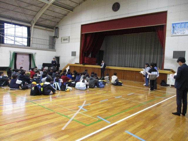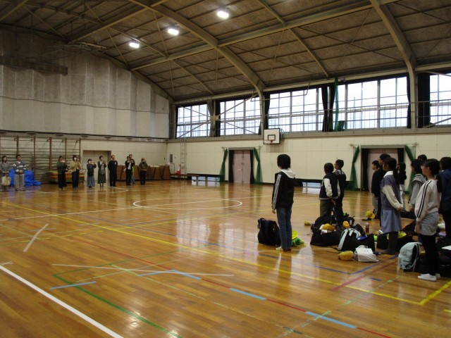 6年生は今日から修学旅行に出かけます。今、出発式を行っています。校長先生からの話を聞いたりおうちの人に「いってきます」を伝えたりしました。
