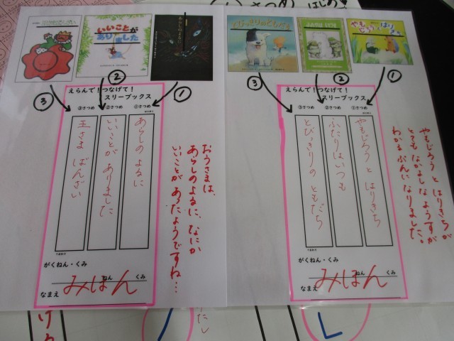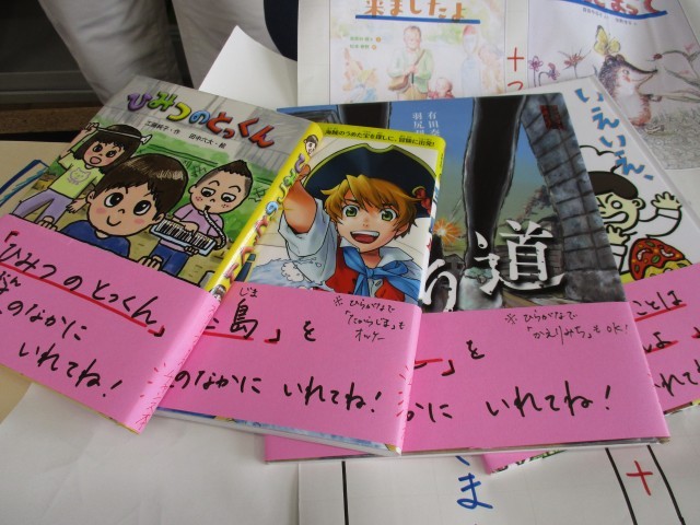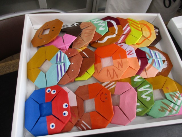 来週の読書月間に向け、司書さんが準備をしていました。今回は、「3冊の本の題名を合わせて文章を作ってみよう」という企画を考えていました。上手に作れたら、おいしそうなおりがみのドーナツがプレゼントされるようです。たくさんの子がたくさんの本に出会えるように、司書さんもがんばっています。