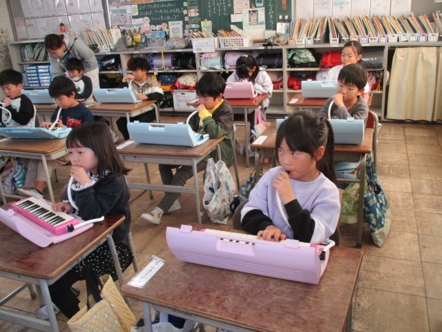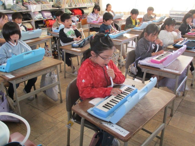 今日はみんなで鍵盤ハーモニカで合奏をしています。