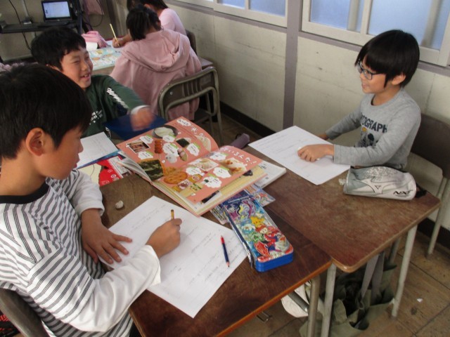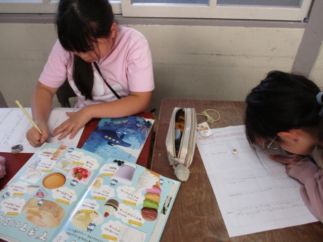 国語の単元「食べ物のひみつを教えます」で、自分で決めた食べ物について本で調べています。