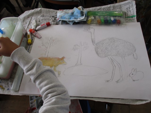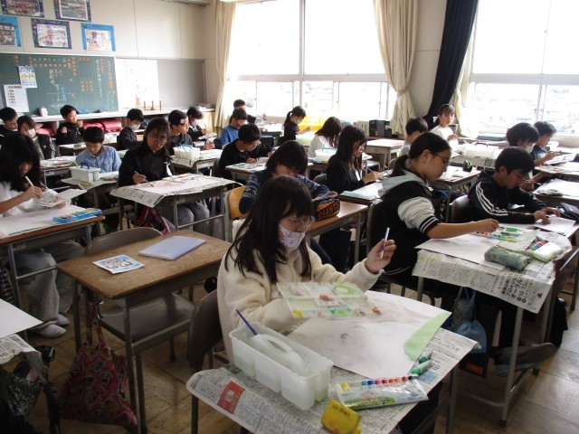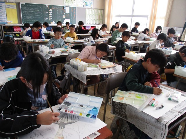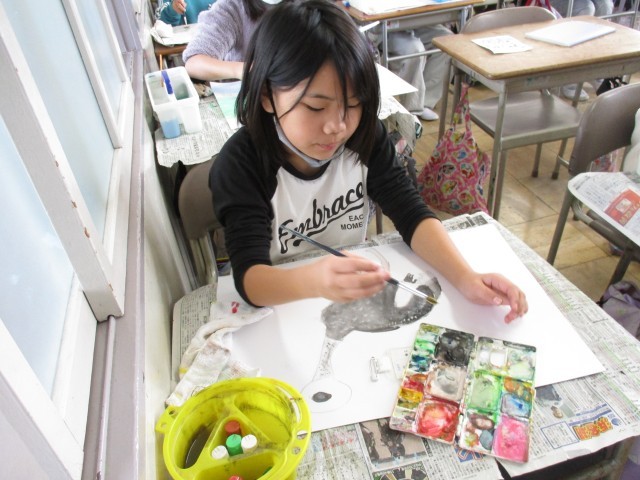 読書感想画を作成中です。色の塗り方に気を付けながら活動していました。