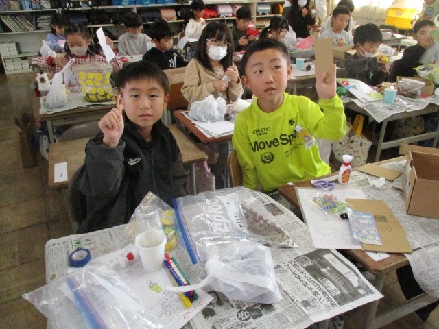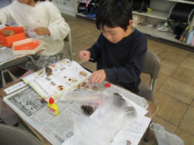 自分たちで集めた木の実や落ち葉をつかっての作品作りです。