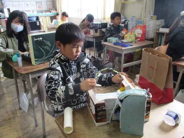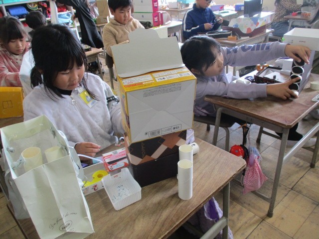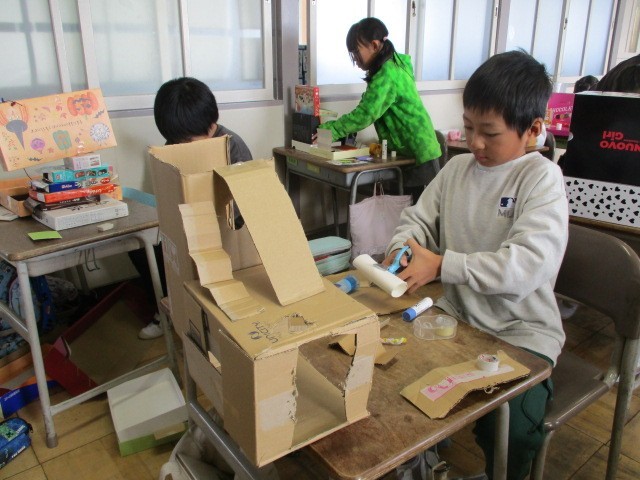 いろいろな大きさの箱を組み合わせて家をつくっています。