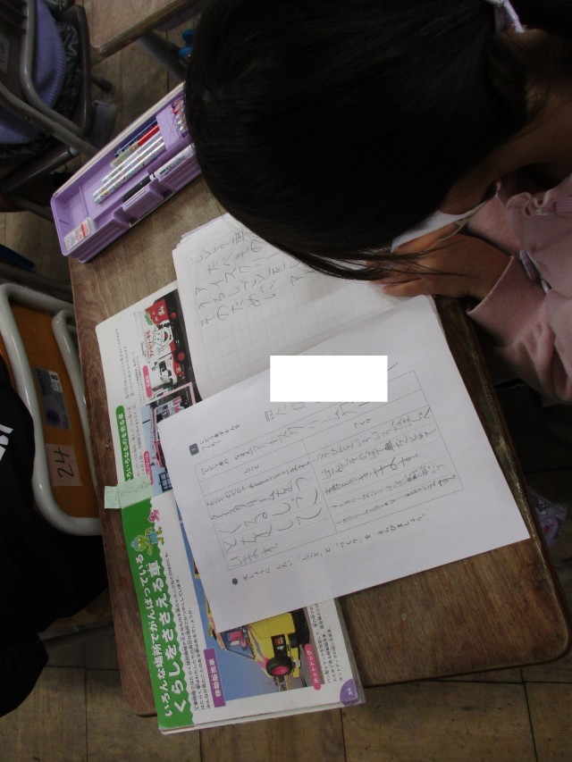 国語の「じどうしゃしらべ」の単元で、本から「はたらくくるま」のしごとやつくりを調べています。今日は、本から見つけた情報を、みんなに説明できるように文章にしました。