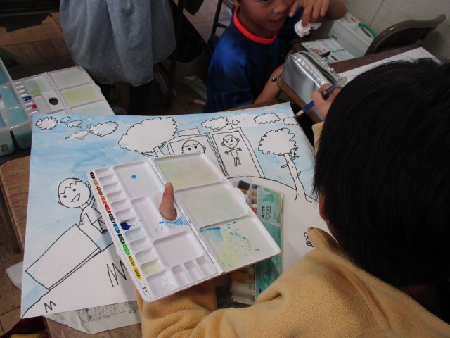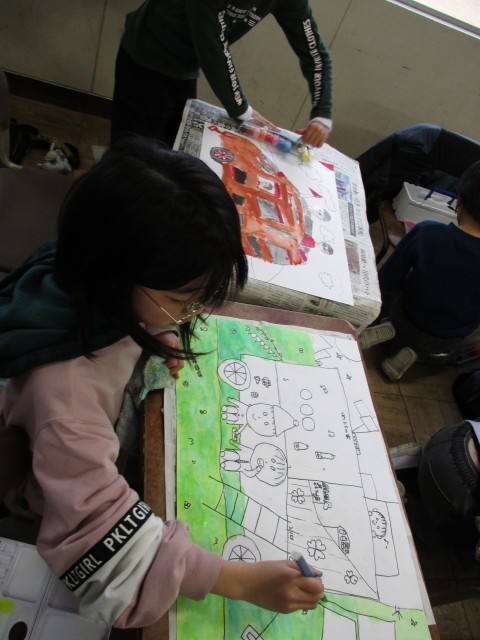図画工作の時間です。読書感想画の下絵がおわり、色を塗る過程に入りました。色の濃さ、水の量に気をつけて、丁寧に塗っていました。