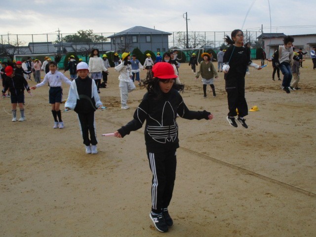 長い休み時間には子どもたちはグランドに出て音楽にあわせてなわとびに取り組んでいます。