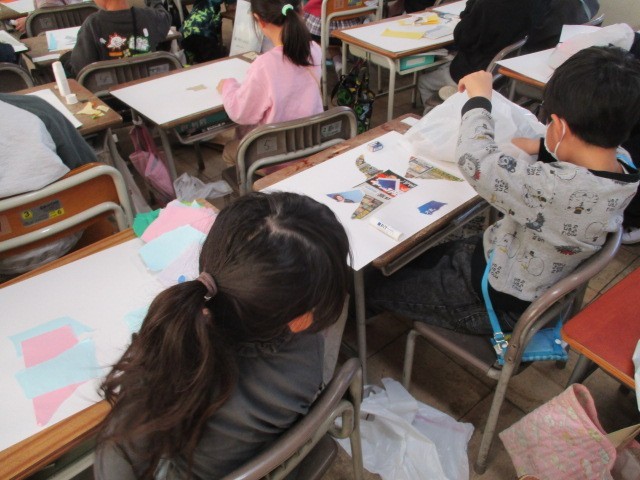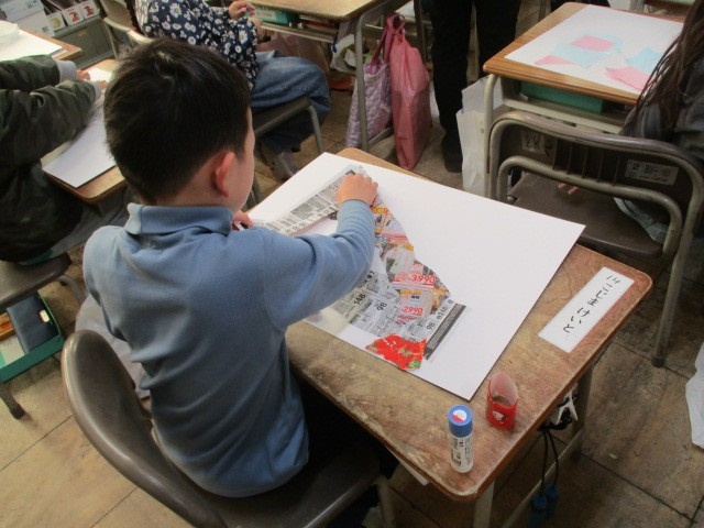 家からもってきた新聞や包装紙を使って貼り絵です。