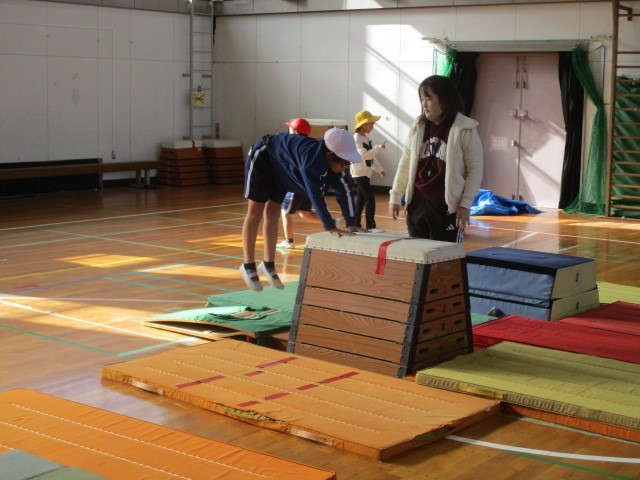 跳べない子は踏切のしかたを先生が丁寧に教えています。