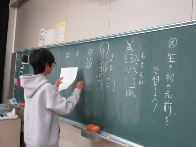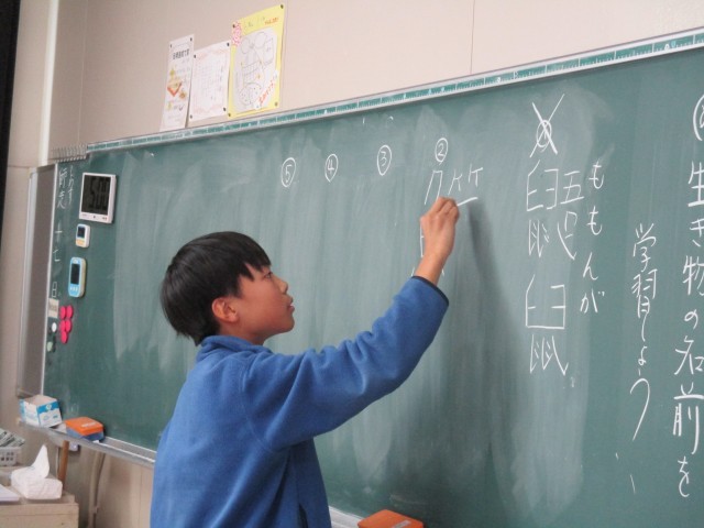 書写の時間に、漢字の読み方を考えながら、その漢字の視写をしました。また、難しい漢字の生き物を調べ、みんなで考えました。