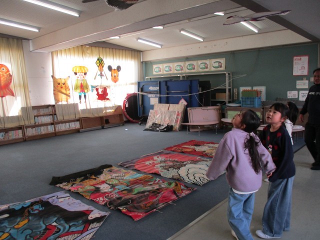 お話広場に、いろいろな種類の凧を展示してもらいました。大きな凧に興味津々でした。凧の絵にもとても魅了されました。