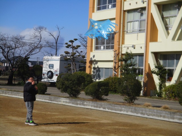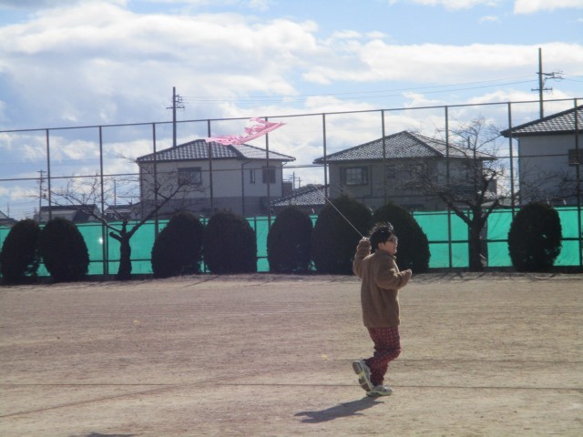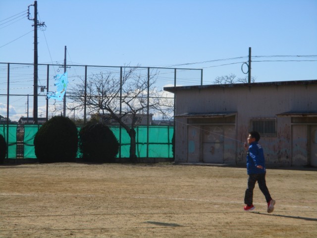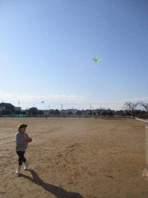 凧作り教室の日は強風でうまく飛ばなかったのですが、この日は風も強くなく、凧が高くあがって、みんな喜んでいました。