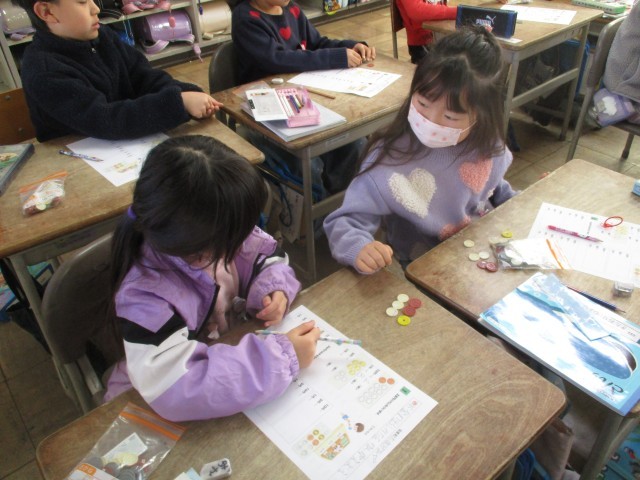 10円玉、5円玉、1円玉を使った学習です。