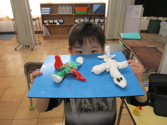 紙粘土で、ジェット機を作りました。図鑑で形を調べ、丁寧に色を塗りました。とても上手にできました。