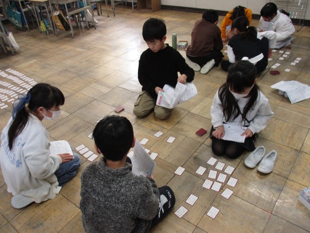 百人一首に取り組んでいます。先生の上の句を聞いているときは、とても緊張した雰囲気です。札がたくさんとれるよう、百人一首が載っている紙を見て覚えながら取り組んでいました。