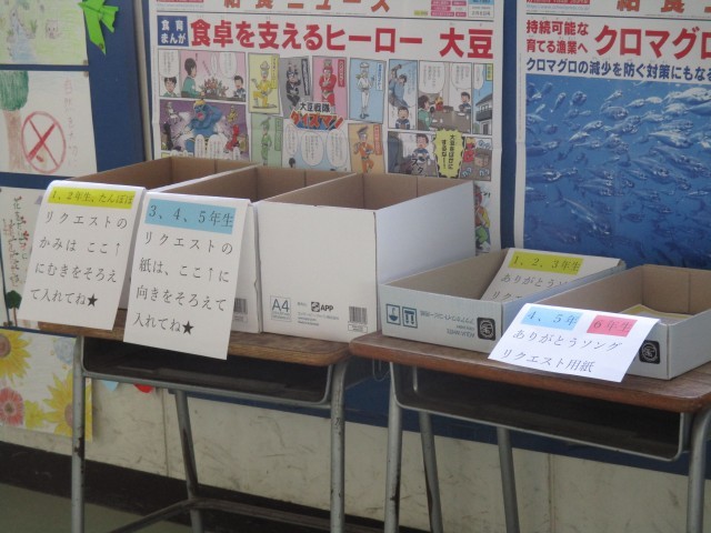 放送委員会がリクエスト曲の募集を企画しました。6年生にありがとうを伝えたいから「ありがとうのはな」をリクエストするという1年生がいました。給食の時間にどんな曲が流れるか楽しみです。