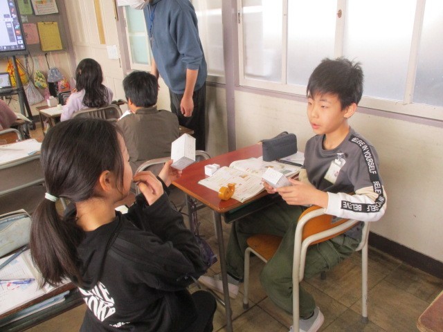 自分が考えた面どうしの関係を友だちに説明しています。