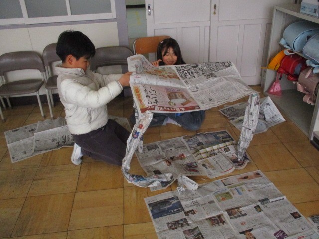 しんぶんを丸めたり、ちぎったり、つなげたりして作品作り。