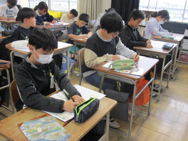 初めての書写の授業がありました。鉛筆の持ち方、正しい姿勢など、もう一度確かめました。落ち着いた雰囲気で練習することができました。