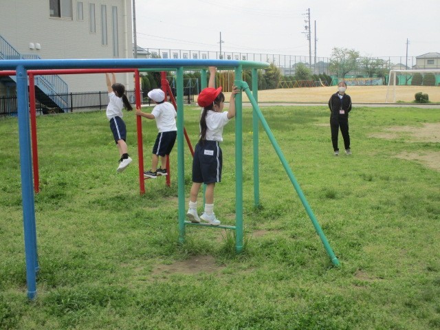 運動場の遊具を使って、体をたくさん動かしました。逆上がりにチャレンジしたり、雲梯にぶら下がったり思い思いの運動をしました。