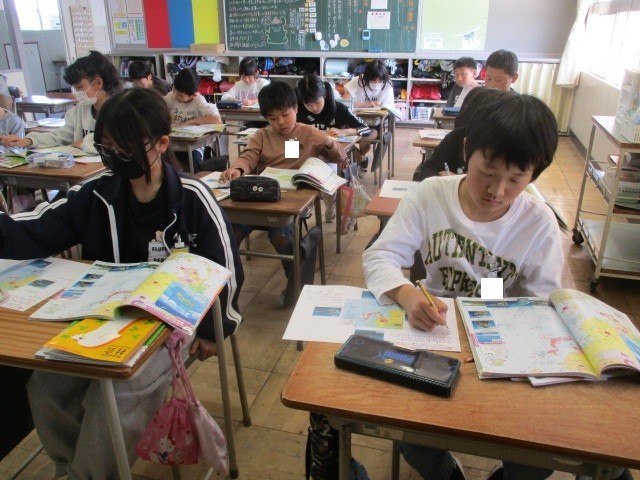 日本の国土の特徴について学習しています。地図帳を見ながら分かったことを書いていきました。