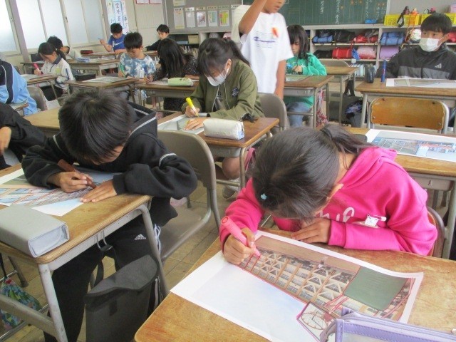 写生会の準備をしています。自分が決めた風景の輪郭を取り、画用紙に写していきます。真剣な表情で取り組んでいました。