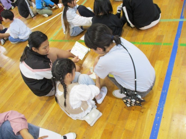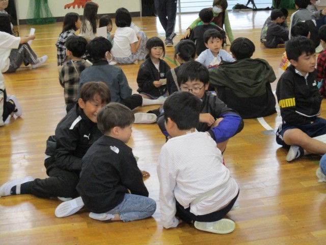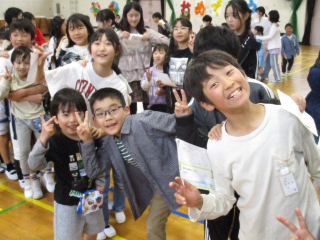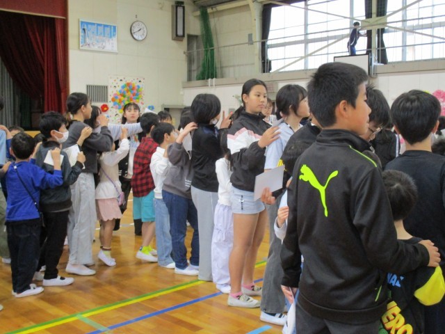 今日のふれあいタイムの時間に、1年生と6年生がペア活動のための顔合わせをしました。自分の自己紹介カードをそれぞれ交換したり、じゃんけん汽車ポッポで遊んだりしました。これからペアでいろいろな活動をしていきます。