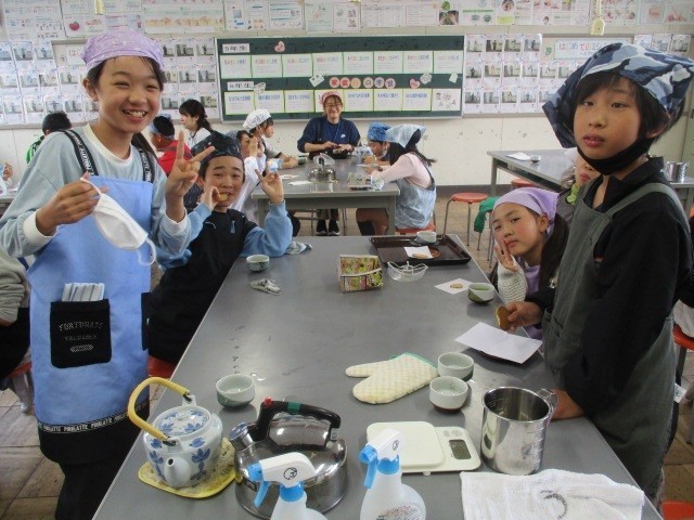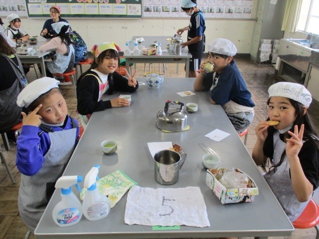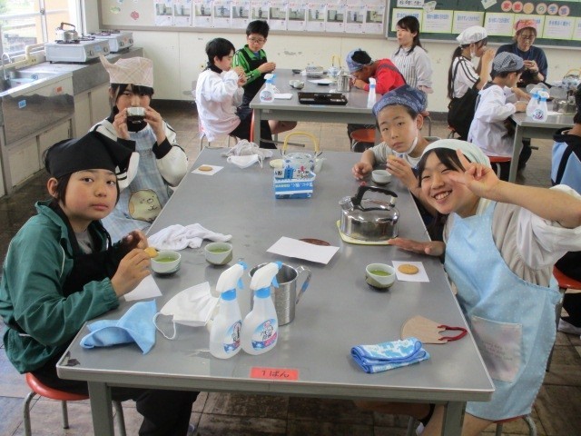 調理実習で、お茶を入れました。班で協力してお茶を入れ、クッキーと一緒にお茶を飲みました。「苦い!」と言っている人もいましたが、とても美味しかったですよ。