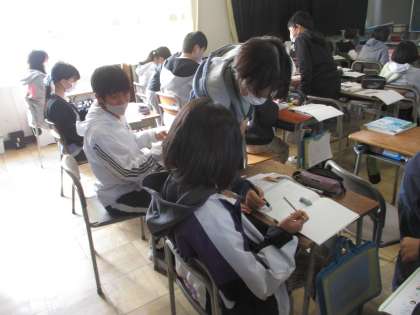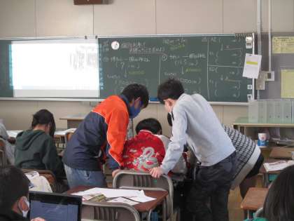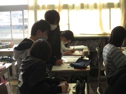 6年生の算数の授業の様子です。先生が一人の子を教えている傍らで友達と教え合う姿がありました。仲間どおし教え合う姿が素晴らしいです。