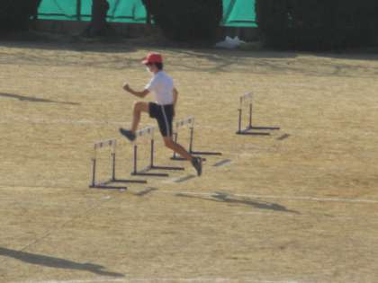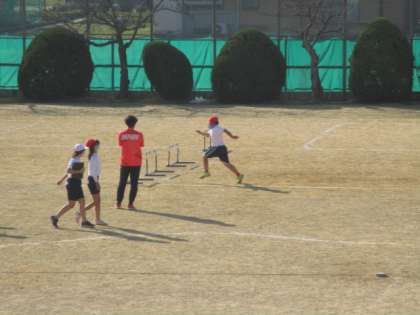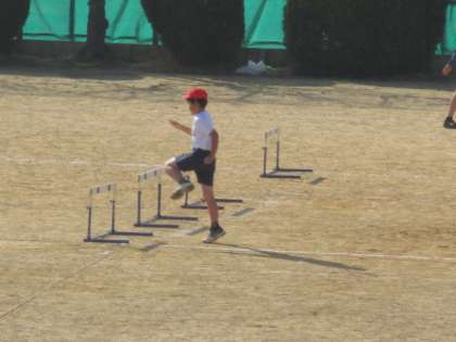 ハードル走に取り組んでいます。今日はどうするとうまく障害を倒さず走り抜けられるかを考えながら何度も練習しました。