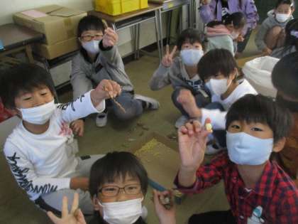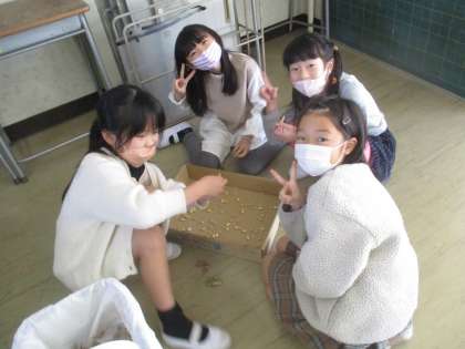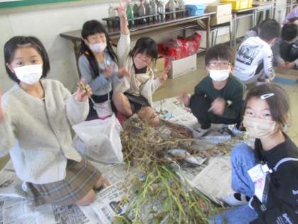 夏にまいたダイズの種が大きくなって、枝豆から大豆に熟しました。収穫したダイズのさやから大豆の実を取り出しました。