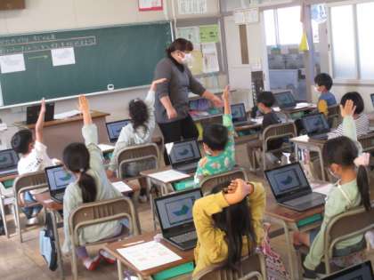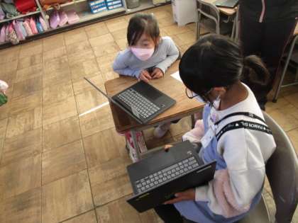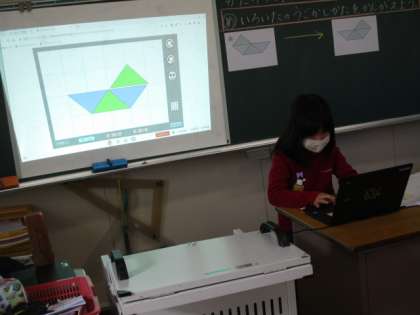 算数で「かたちづくり」の勉強をしています。今日はChromebookを活用してどのように色板を動かせば同じ形が作れるかを考えました。