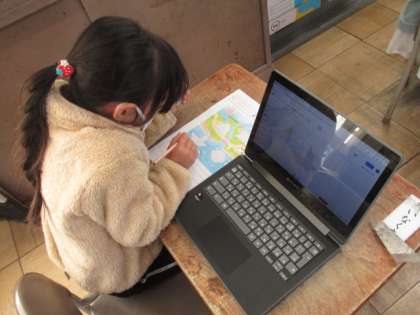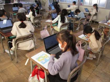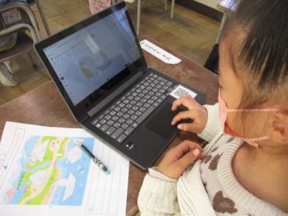 算数で図形の勉強をしています。今日はある形の影が小さな三角形のピースを何枚使えば完成するかをChromebookを活用して考えました。