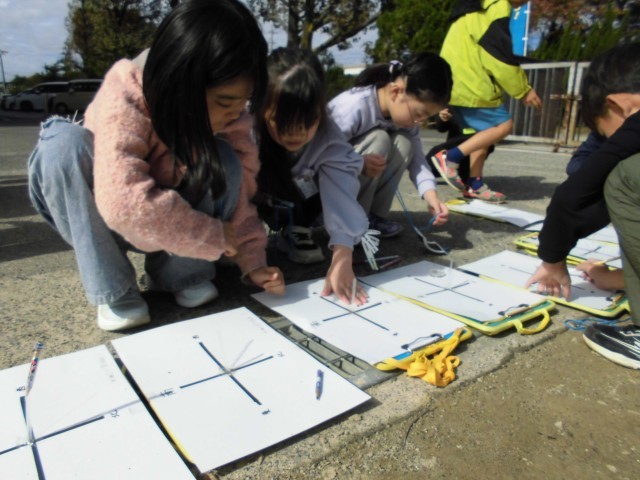前回の理科の時間に観察記録用紙を作り、かげの向きと太陽の位置を調べる観察をしました。最初に方位磁針の使い方を確認し、観察用紙を外に設置しました。1日に3回観察し、かげの向きを用紙に記録しました。次回、太陽の向きを記入し、かげの向きと太陽の位置についてまとめる予定です。