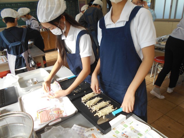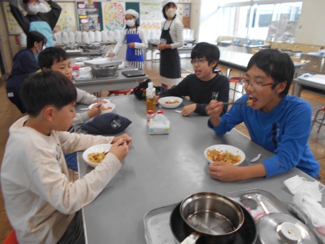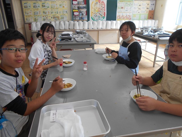 今日の6年生の家庭科は調理実習でした。今回は「ベーコンポテト」「厚揚げとウインナーのチャンプルー」「野菜のベーコン巻」から班で好きなメニューを選んで作りました。それぞれのつくり方を動画で確認しながら、手際よく作業をしていました。できた料理はどの班もとてもおいしそうでした。片付けまでとてもスムーズにやっていました。ぜひご自宅でも、お子様と一緒に作ってみてください。