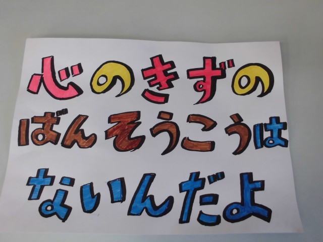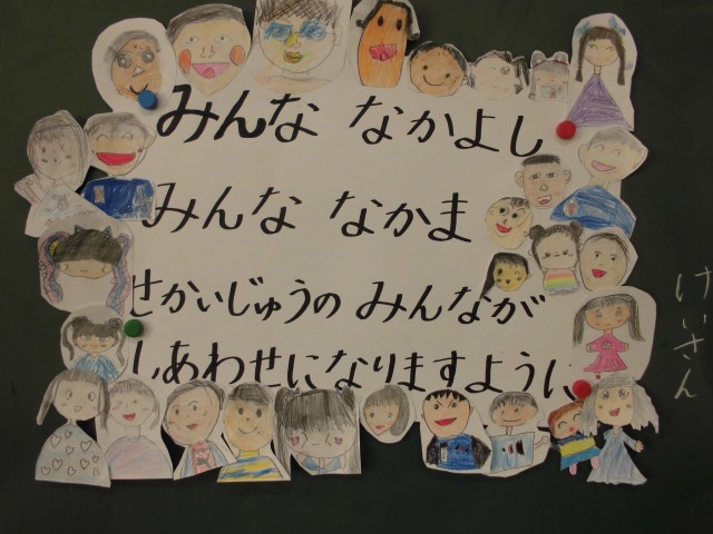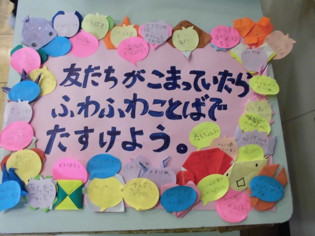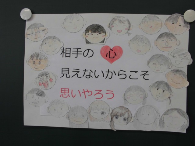 校長講話では、「人は一人一人違うことが当たり前である」ことと、「安心できるクラス・学校は一人一人の『やさしい心』が集まってつくられる、だからやさしい心を出し合っていこう」という話をしました。