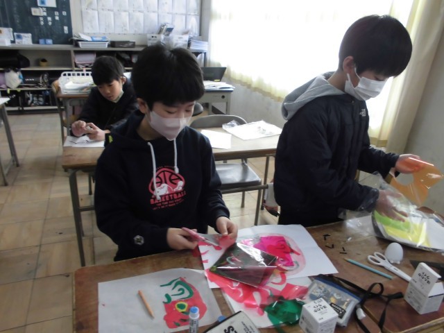 図工では、光と場所のハーモニーという学習で「ぼんぼり作り」をしています。カラーセロハンを貼り付けて色の鮮やかさや形を工夫して作品を作りました。みんなで光をつけたときに、どのような素敵な空間が出来上がるのか楽しみです。