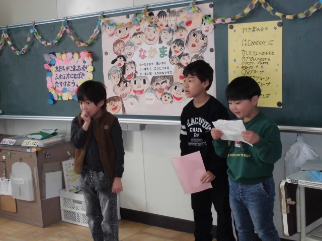 今日は学級でお楽しみ会をしました。今回も、自分たちで出し物やコーナーを考えました。出番の前には、スクラムを組んで気合いを入れる姿も!2年生も残りわずかになりました。体調に気をつけて修了式まで元気に過ごしましょう。