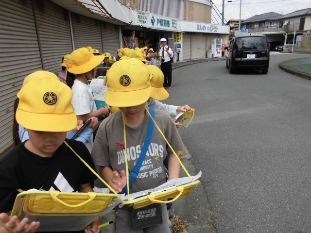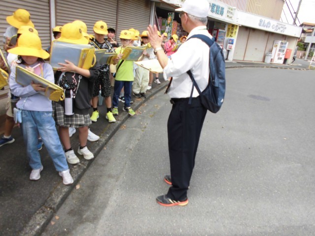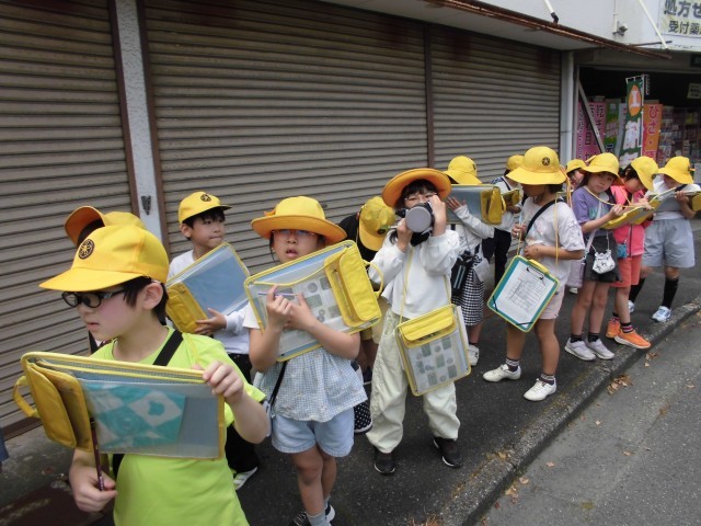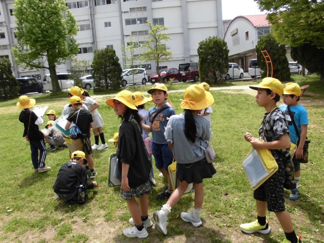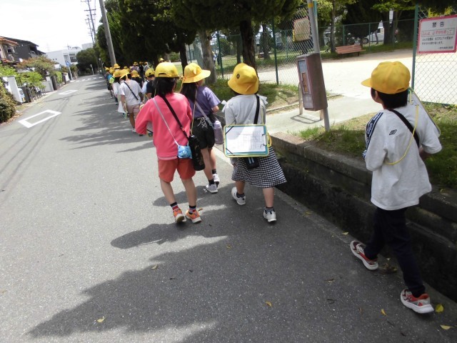 今日は、学校のまわりを歩いてきました。どこに、どんなものがあるのかをメモし、見学中に気づいたことを記録しました。自分の住んでいる町でも、知らないことばかりで、子どもたちはワクワクしながら見ることができました。みんな交通安全に気をつけて歩くことができました。