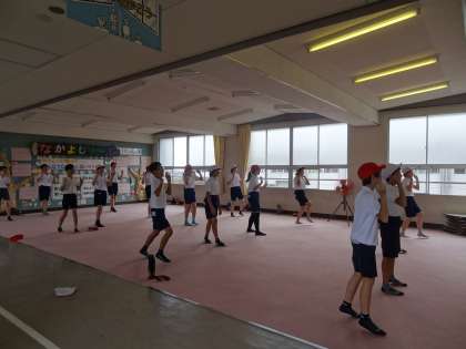 軽快なリズムの曲に合わせて、楽しく踊りました。手や足を上げ下げしたり、途中で隣の友だちとじゃんけんしたりしながら、笑顔いっぱいで取り組んでいました。