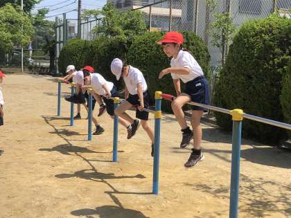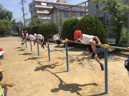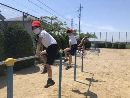熱中症対策でマスクを外すこともあり、距離を取り、一言も話さずに黙々と取り組みました。中には、補助具なしで回ったり、ぐるぐると連続で回ったりする子もいました。