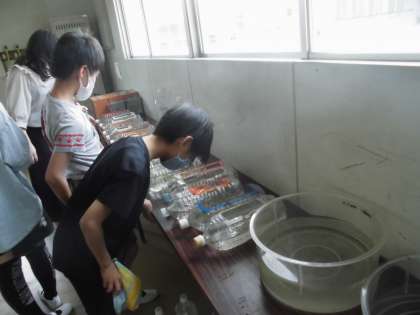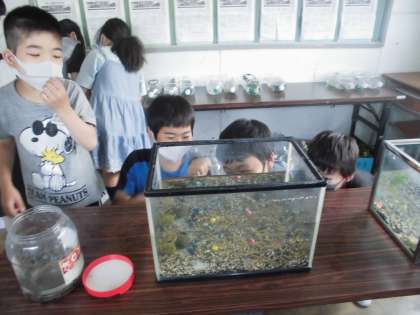 放課になると子どもたちはメダカの様子を見にやってきます。水槽のメダカと自分たちのペットボトル水槽のメダカ。そして、先週まで卵だったものから子メダカがたくさん産まれていました。えさをあげたり、水替えをしたり、大切に育てて観察しています。