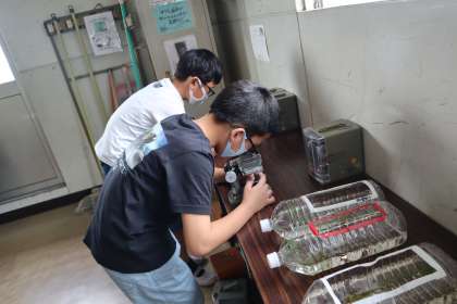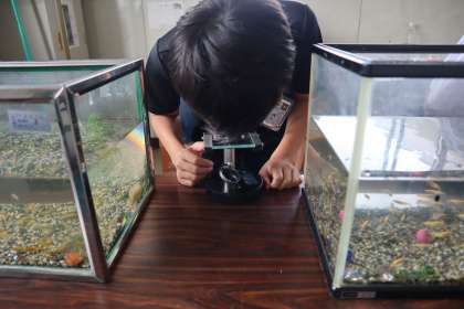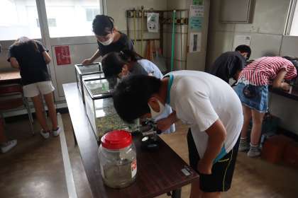 解剖顕微鏡を使って、育てているメダカの卵の観察を行いました。解剖顕微鏡の使い方や各部の名称を習い、自分で顕微鏡を操作しました。卵を見て、「目があるよ!」「もう心臓も動いている!」「もうすぐ、生まれそう!」と子どもたちはメダカの卵の様子に驚いている様子でした。
