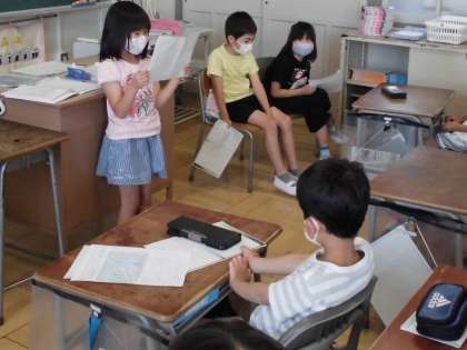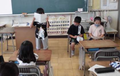先週まちたんけんをしました。今日はまちたんけんで見つけたものをお友達に紹介しました。「はじめ」「中」「終わり」に気を付けて文章を構成して、とても上手にまとめたものを、みんなの前で堂々と発表することができました。聞く姿勢も大変良く、発表者も気持ちよく発表できたと思います。