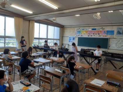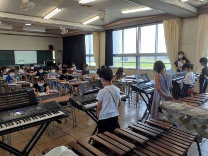 音楽では、「ドレミの歌」をキーボードや木琴を使って演奏しています。他の音との重なりを感じて演奏したときの良さを見つけていました。