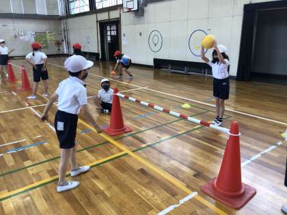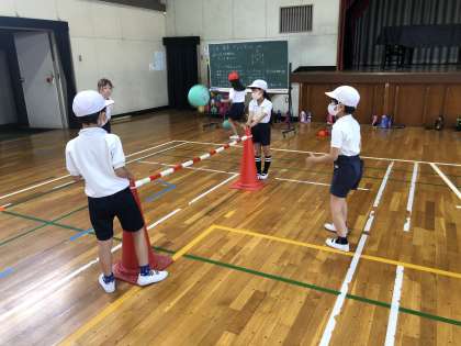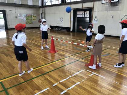 練習を何度もしたことで、グループのメンバーが変わっても、スムーズに準備をして始めることができました。力加減や落とす場所を試行錯誤しながら相手のコートにボールを落とそうとしていましたが、ラリーが続く上手なグループに対し、早く試合が終わった児童が「がんばれ!」を声をかけていました。