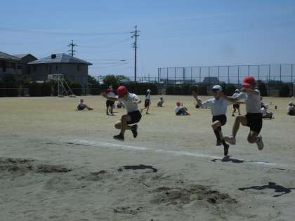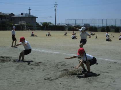 体育では、走り幅跳びを行っています。記録が伸びるようコツを習い、上の方を向いて高く跳んだり、身体を「く」の字や「ん」の字のようにして着地したりしました。「記録がすごい伸びた!」と喜んでいる子や「まだまだいけそうかな。」と言っている子がいました。次回も記録更新に向けて頑張ります。
