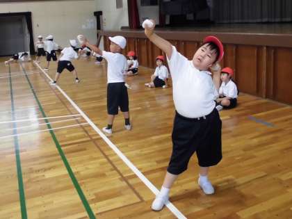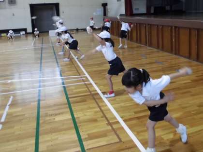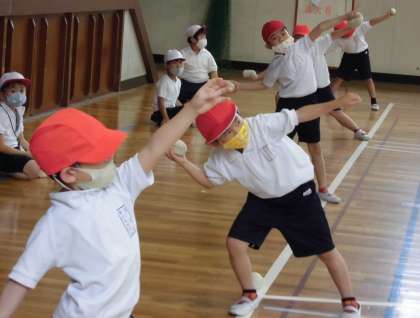 斜め上にねらいを定めて、腕を大きく振ります。練習を重ね、だんだん上手に投げられるようになってきました。
