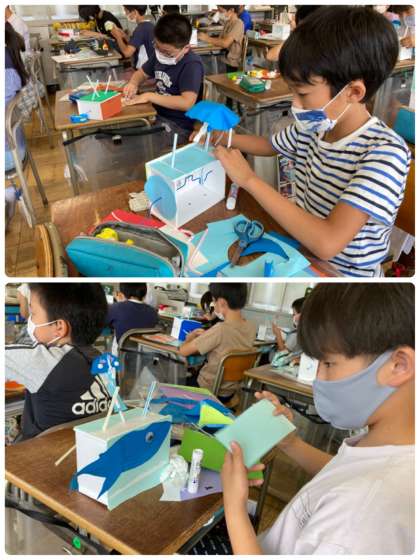 図工の作品「くるくるクランク」の作成を続けています。今回は実際に手で動きを確認しながらつくりました。自分の表現したいものとクランクの動きがあうように工夫しています。